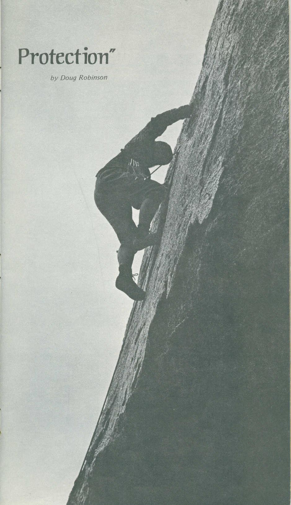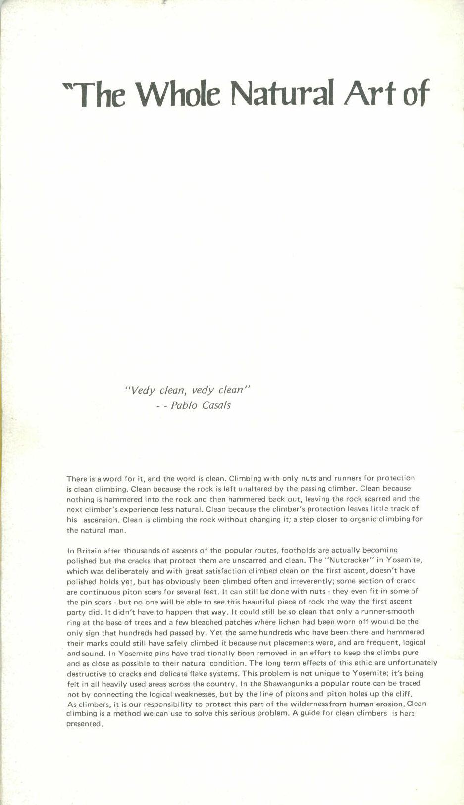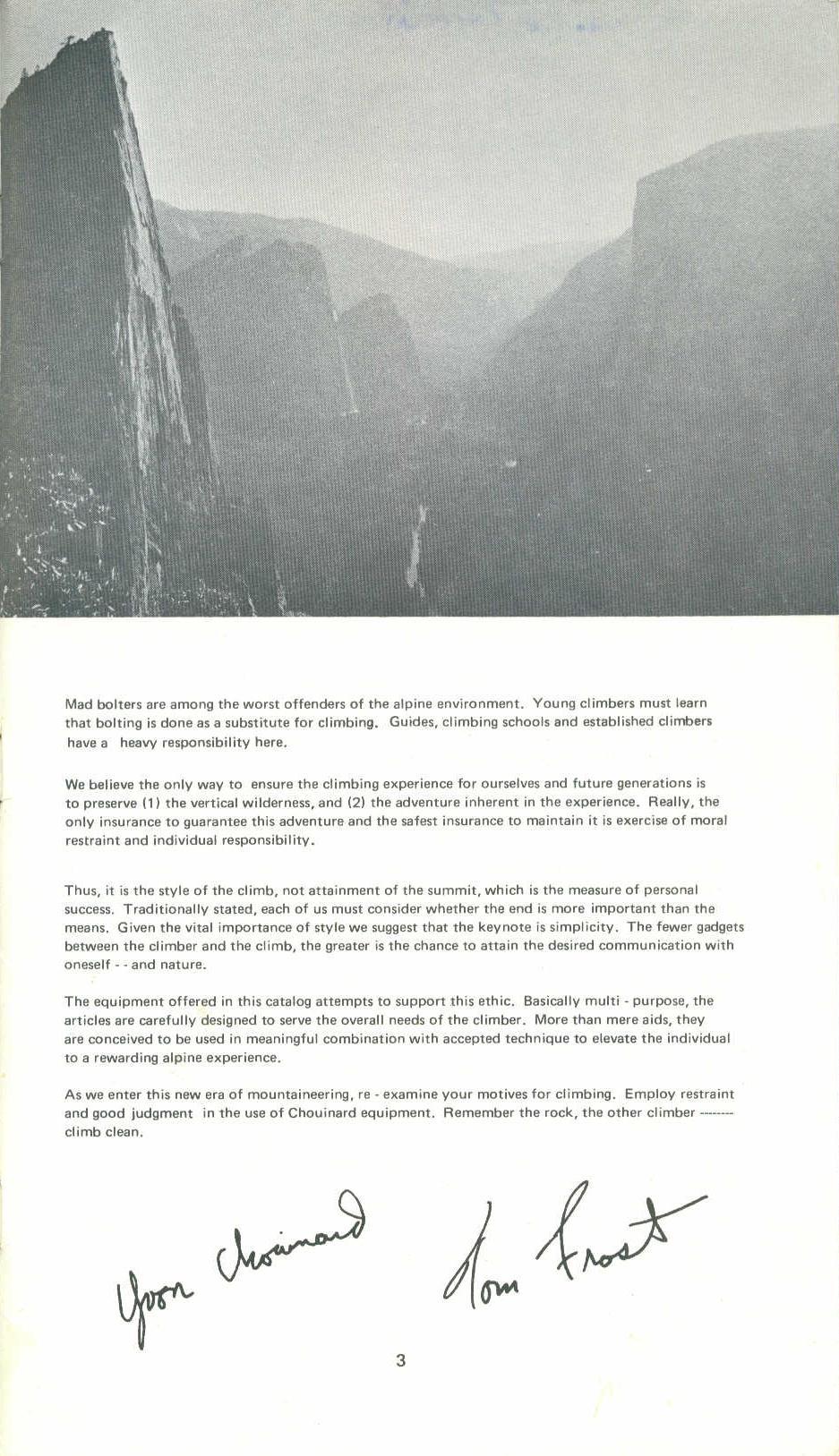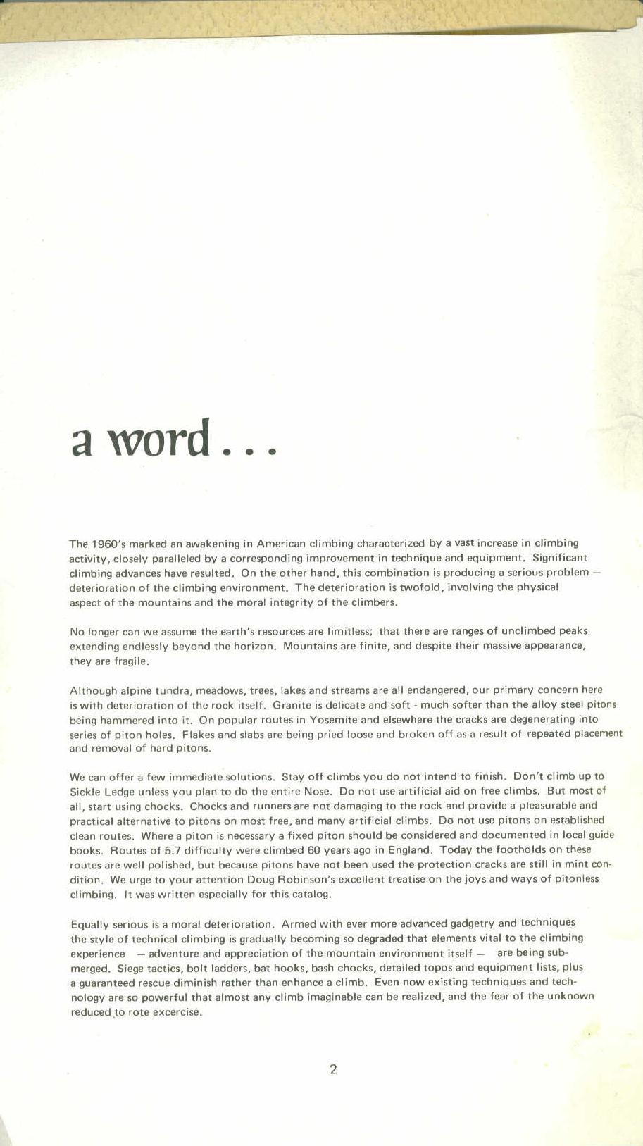 There are the two environmental essays found in the Chouinard '72 catalog. "A Word..." by Yvon Chouinard and Tom Frost, on pages 2-3 and Doug Robinson's treatise, "The Whole Natural Art of Protection" which follows.