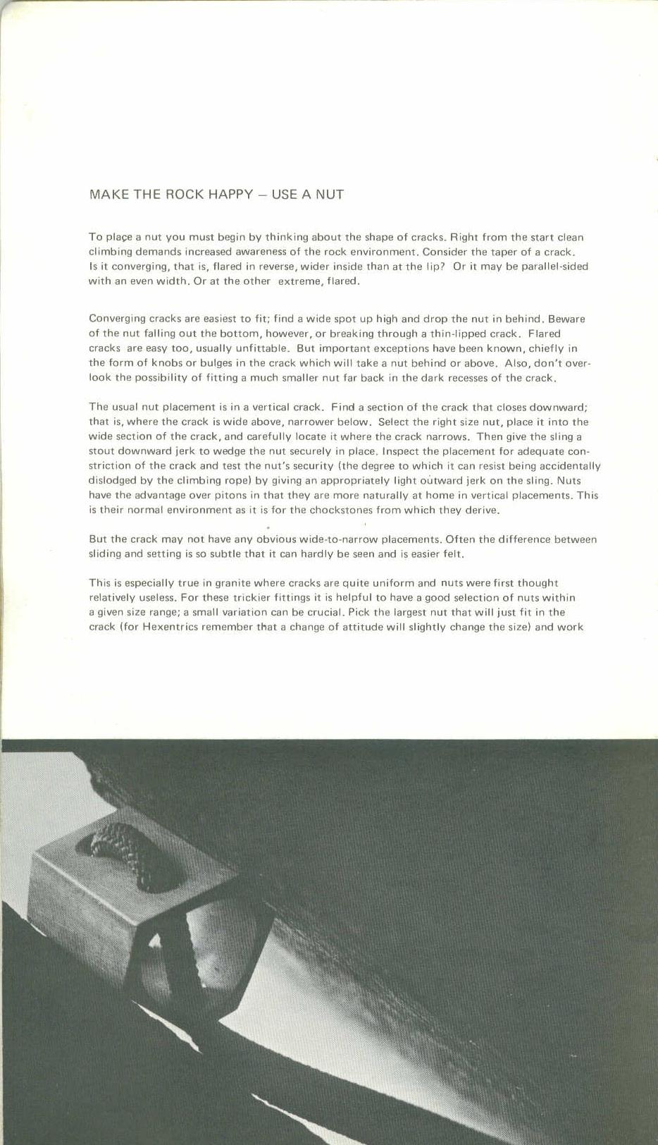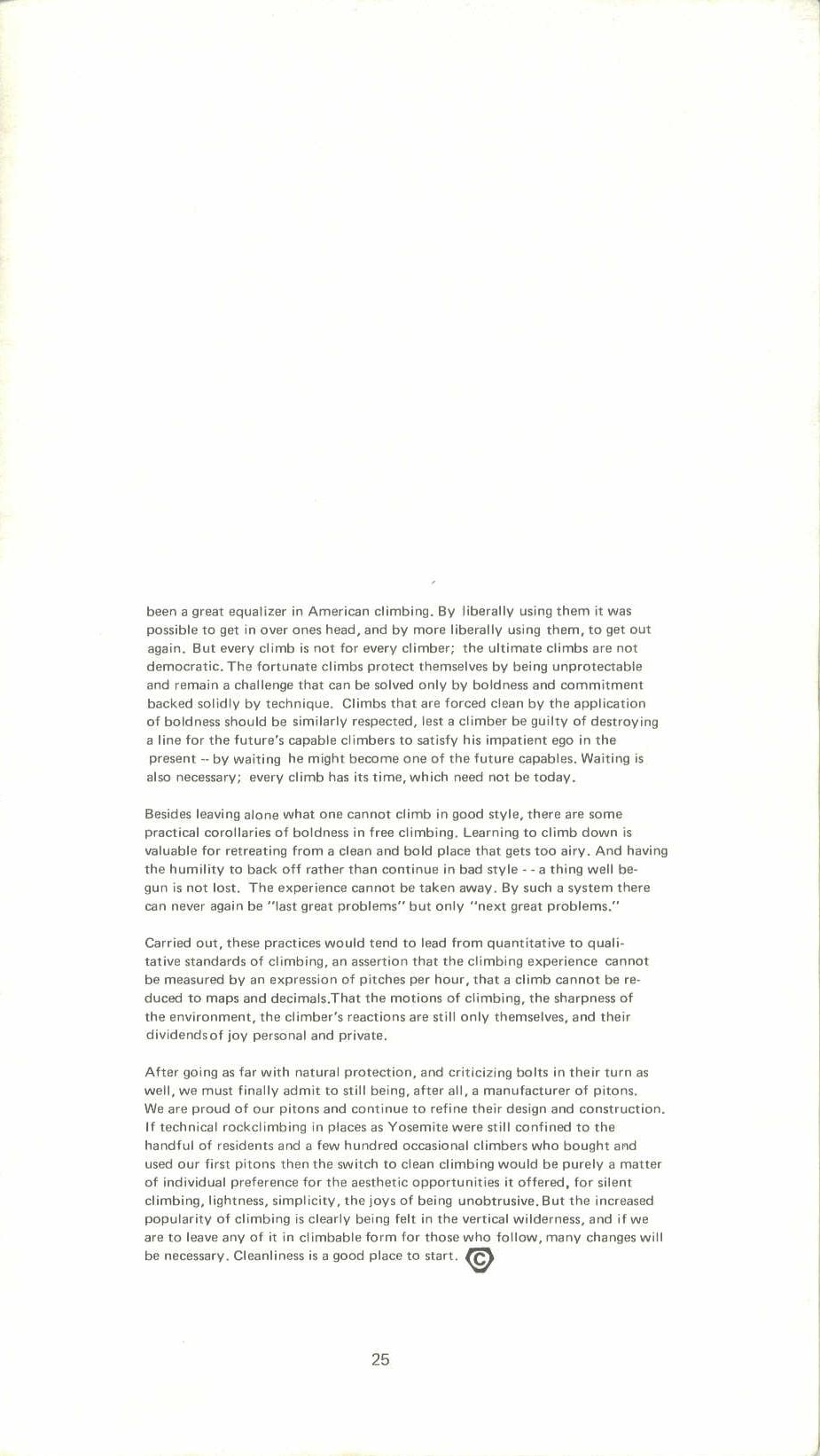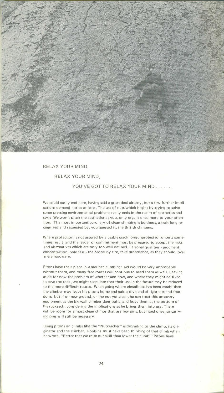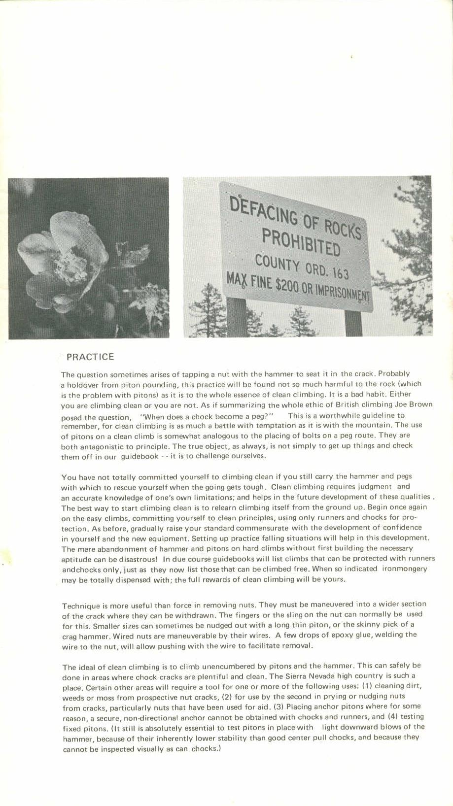 There are the two environmental essays found in the Chouinard '72 catalog. "A Word..." by Yvon Chouinard and Tom Frost, on pages 2-3 and Doug Robinson's treatise, "The Whole Natural Art of Protection" which follows.